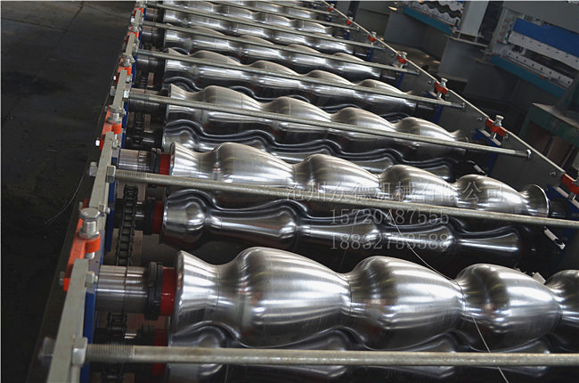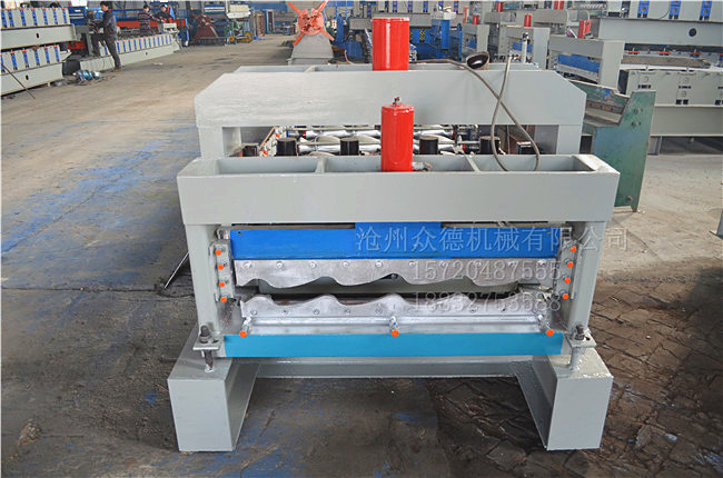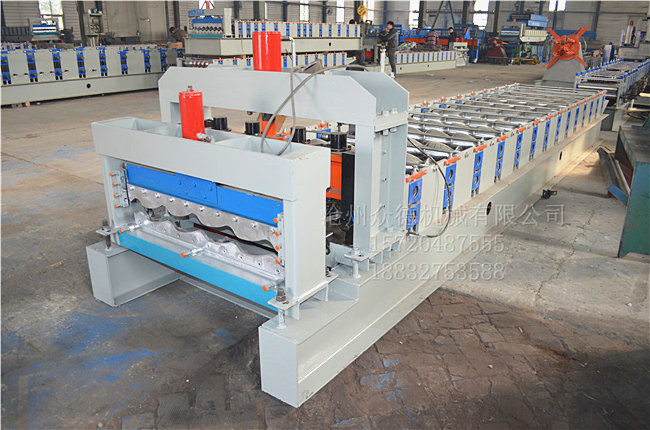 :眾德機(jī)械 名稱(chēng):828偏弧琉璃瓦設(shè)備 用途:用于加工金屬板琉璃瓦 電機(jī)功率:4kw 機(jī)器重量:4T 剪切方式:液壓切斷 傳動(dòng)方式:鏈輪+鏈條傳動(dòng) 外形尺寸:7800*1500*1500mm 加工板材厚度:0.2-0.8mm PLC控制器:采用 全自動(dòng)角馳828型偏弧琉璃瓦壓瓦機(jī),設(shè)備主要由裝料架,裝料架支座,進(jìn)料導(dǎo)入平臺(tái),校平裝置,壓型主機(jī),定型裝置,成型剪切裝置,液壓泵站,全數(shù)控電腦自動(dòng)控制柜等幾部分組成.